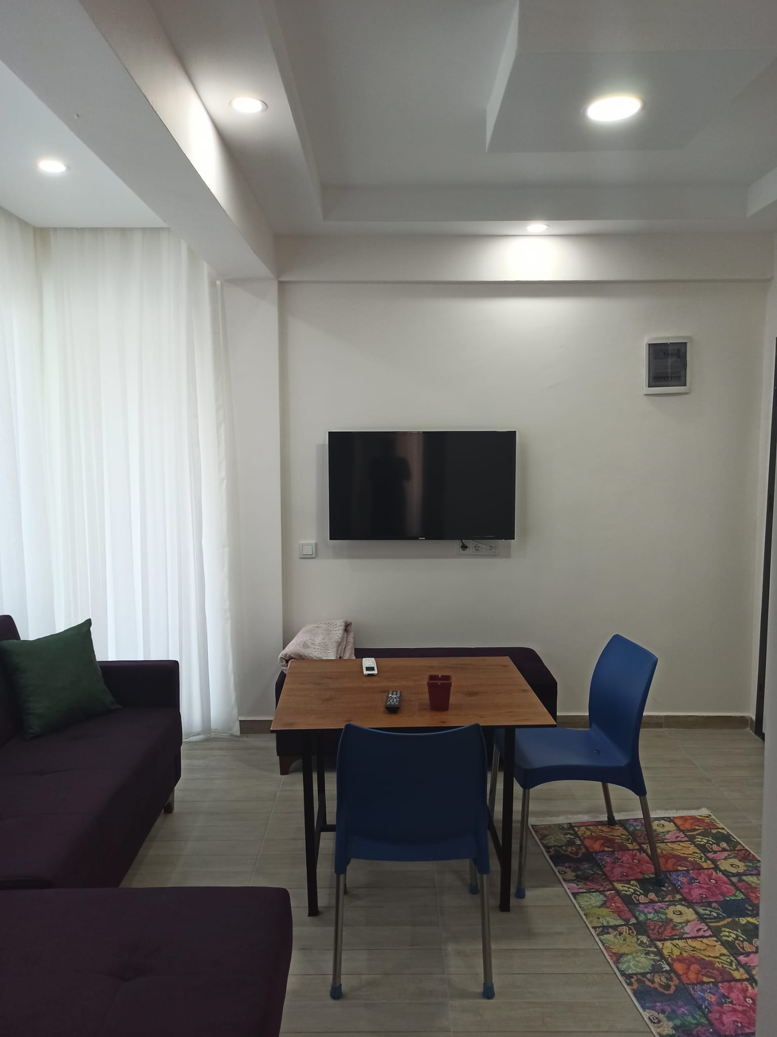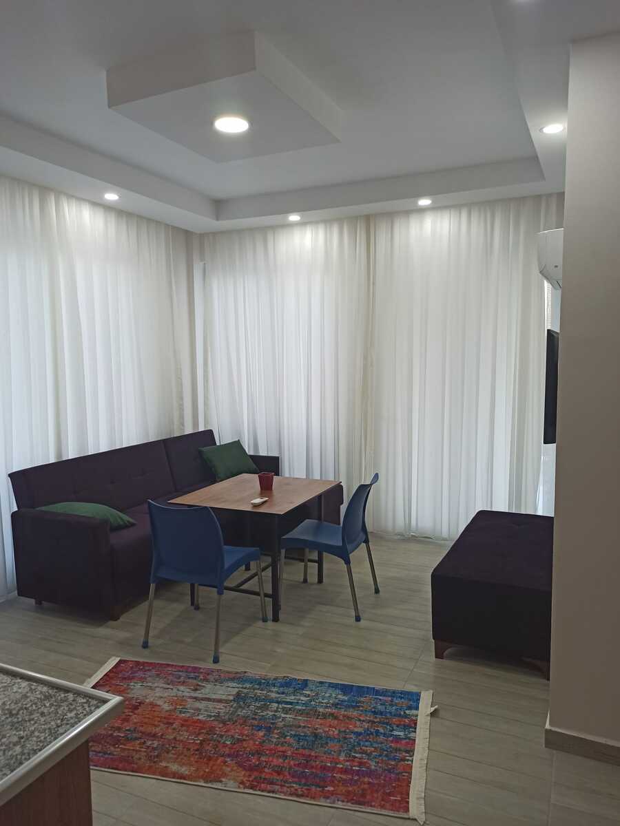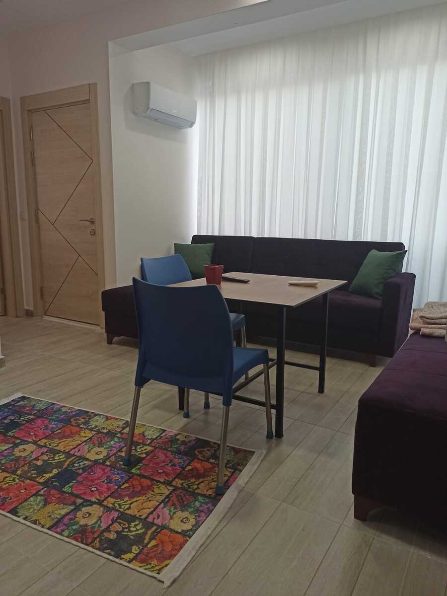 Oturma odası/mutfak alanında çekyat, TV ünitesi, kare masa ve sandalyeler bulunmaktadır.